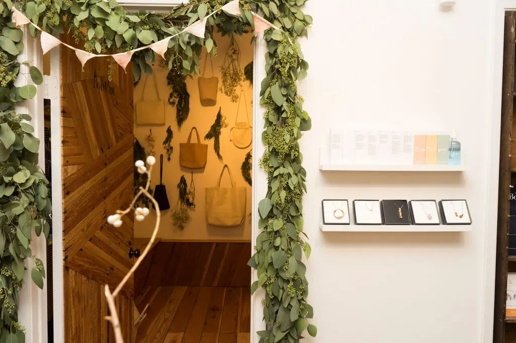 그리고 겨울 팝업 상점에서 디스플레이된 냅킨과 문에 걸어 놓은 갈렌드.