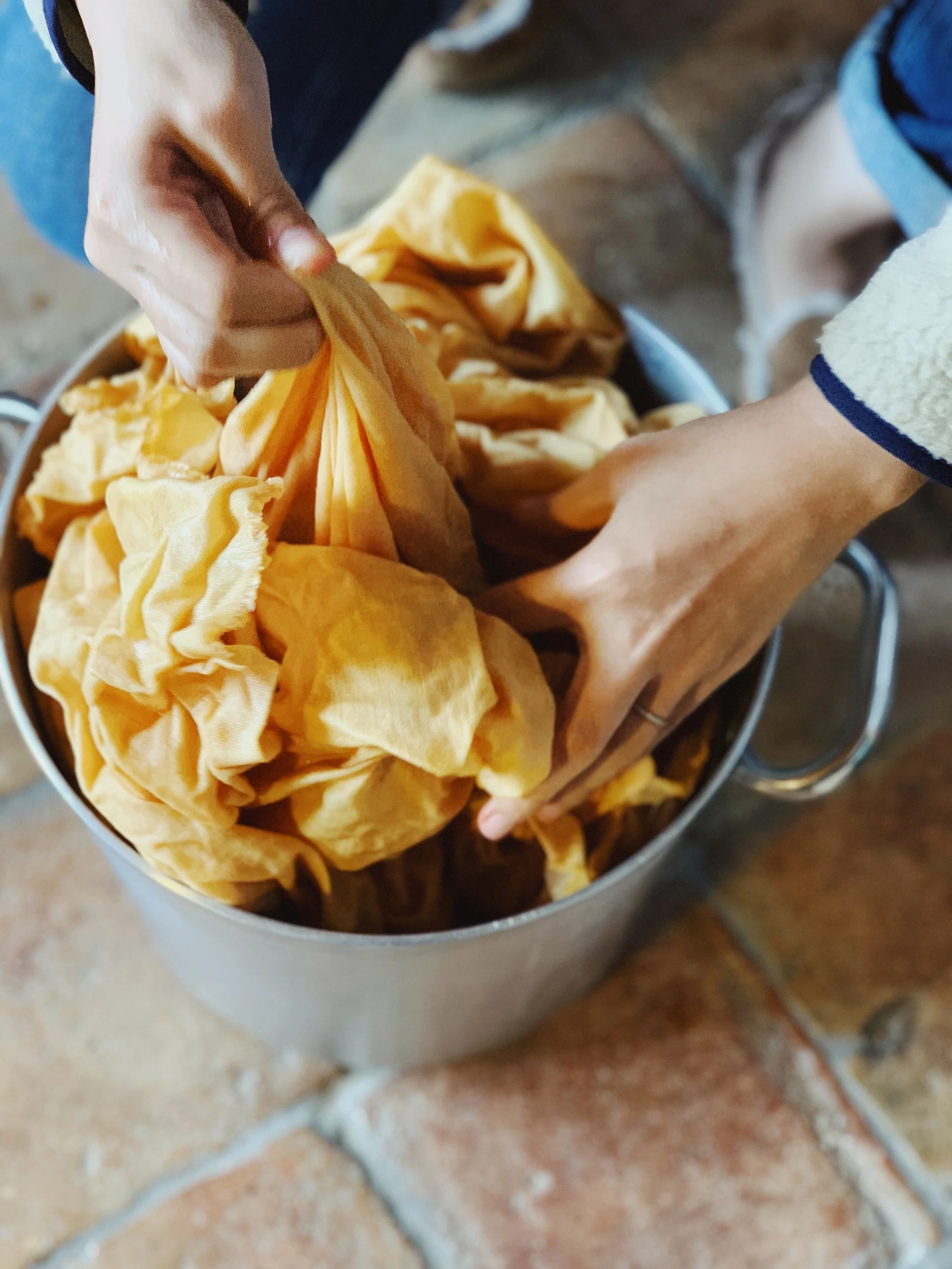양파 껍질은 아보카도와 다르게 물을 붓자마자 바로 노란 물이 우려 나왔습니다. 양파는 노란색을 만든다고 하는데, 우려 나온 색을 보아하니 아주 노란색은 아니고 주황빛이 섞인 노란색이 될 것 같았습니다. 소량의 양파 껍질로 엄청 농축된 물이 나온 것 같아 더 진해질까 싶어 이틀 정도 방치시켰습니다.