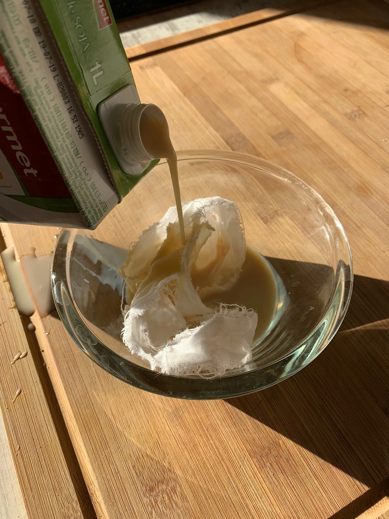 1) 두유 1, 물 2 혼합 용액에 프리워시가 끝난 천을 24시간 담가 놓는다