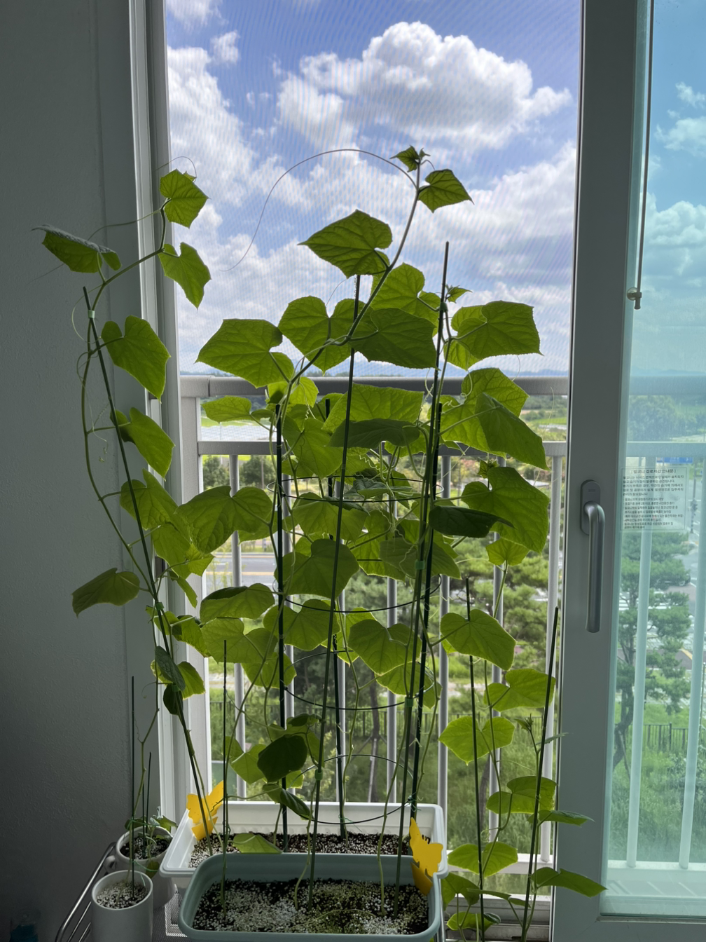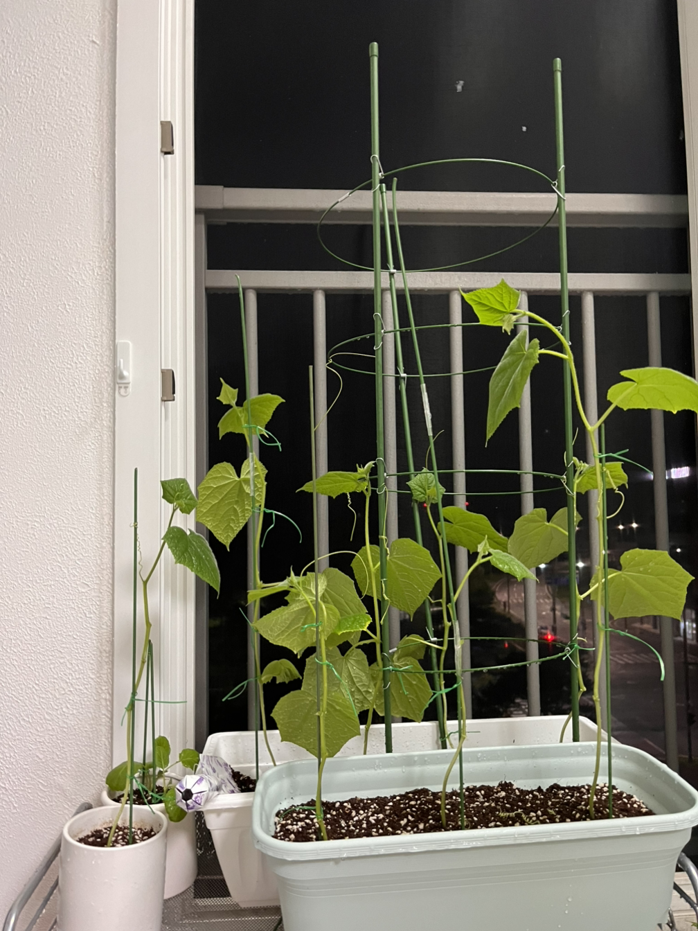 햇볕과 물을 잔뜩 머금고 커져가는 잎과, 꼬불꼬불한 오이 손이 지지대를 잡고 올라가는 모습을 보면 마음이 한없이 기뻐진다!