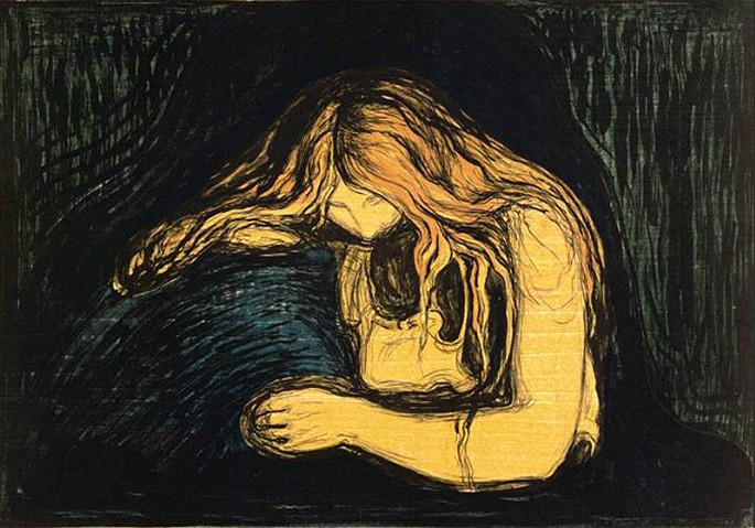 붉은 머리칼의 여인이 남자의 머리를 감싸안고 있습니다.