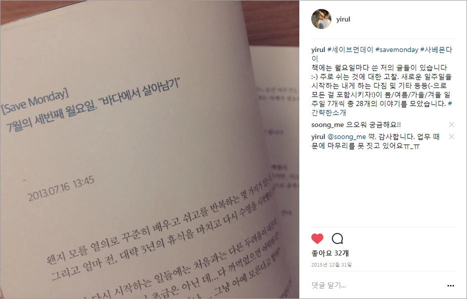 월요일을 쉬는 회사에 다니며 나의 월요일을 '기록(save)'하고 '구하기(save)'위해서 적었던 약 3년 동안의 일기와 장거리 연애의 아슬아슬함을 달래준 필름 카메라 사진들로 구성된 책이다.