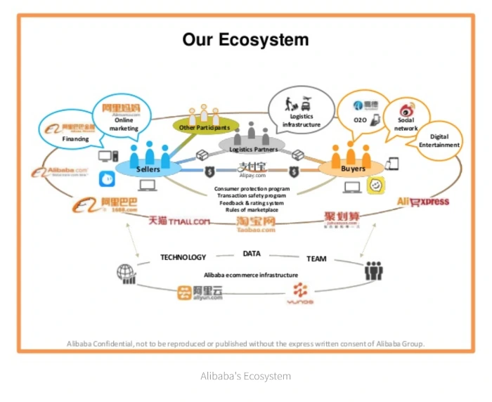 알리바바는 전자 상거래의 모든 비즈니스 관계를 플랫폼에서 구현한 뒤 입점 수수료 무료 정책을 시행해 중국 전체의 소상공인들의 판로를 열어 주었다. 결제 기능을 진입점으로 삼아 일상의 모든 행위에 필요한 것들을 페이로 결집시켰고 플랫폼 안에서 수많은 공급자와 소비자가 연결되고, 생산, 마케팅, 판매, 결제 유통 등 공급 사슬의 전과정이 이루어진다. 플랫폼 구조 내에서 경제 순환 체졔를 가지게 된 것이다.