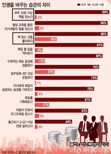 <부자 되는 습관>의 저자 토마스 C. 콜리는 223명의 부자와 128명의 가난한 사람들을 대상으로 그들의 습관을 조사했다. 가장 괴리가 큰 항목은 "하루 30분 이상 책을 읽는다"였다. 부자들은 88%가 하루 30분 이상 책을 읽었지만 가난한 사람은 2%였다. 여기까지는 누구나 알고 있는 사실이다. 부자는 책을 가까이하고, 가난한 사람은 TV를 가까이하는 것이 사이언스.