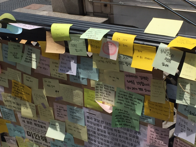 불과 2주 사이를 두고 서울 2호선의 두 역이 거대한 추모와 공론의 장이 되었다. 지난 5월 17일 강남역 인근 공중화장실에서 혐오범죄에 이제 23살 여성이 피살된 데 이어 이번에는 이제 20살을 갓 지난 청년 비정규직 노동자가 지하철 스크린 도어 보수 과정에서 지하철과 스크린 도어 사이에서 목숨을 잃었다. 잠실 철교를 가운데 두고 몇 정거장 되지 않는 역 사이는 애도와 공감, 분노와 절망의 목소리로 가득찼고, 두 역사는 어느새 추모와 애도의 언명이 적힌 포스트잇과 조화들에게 그 여백을 내어 주었다.