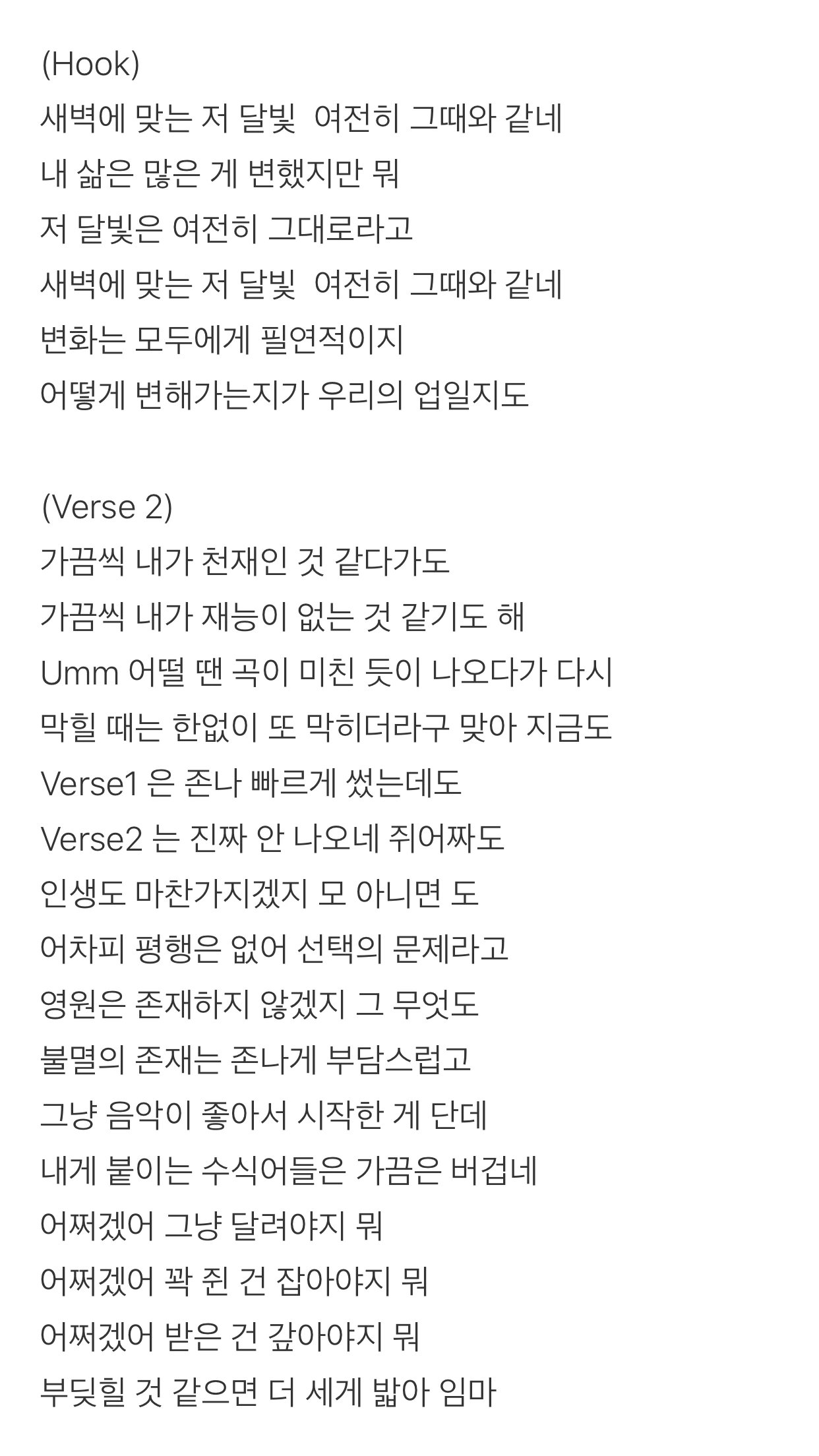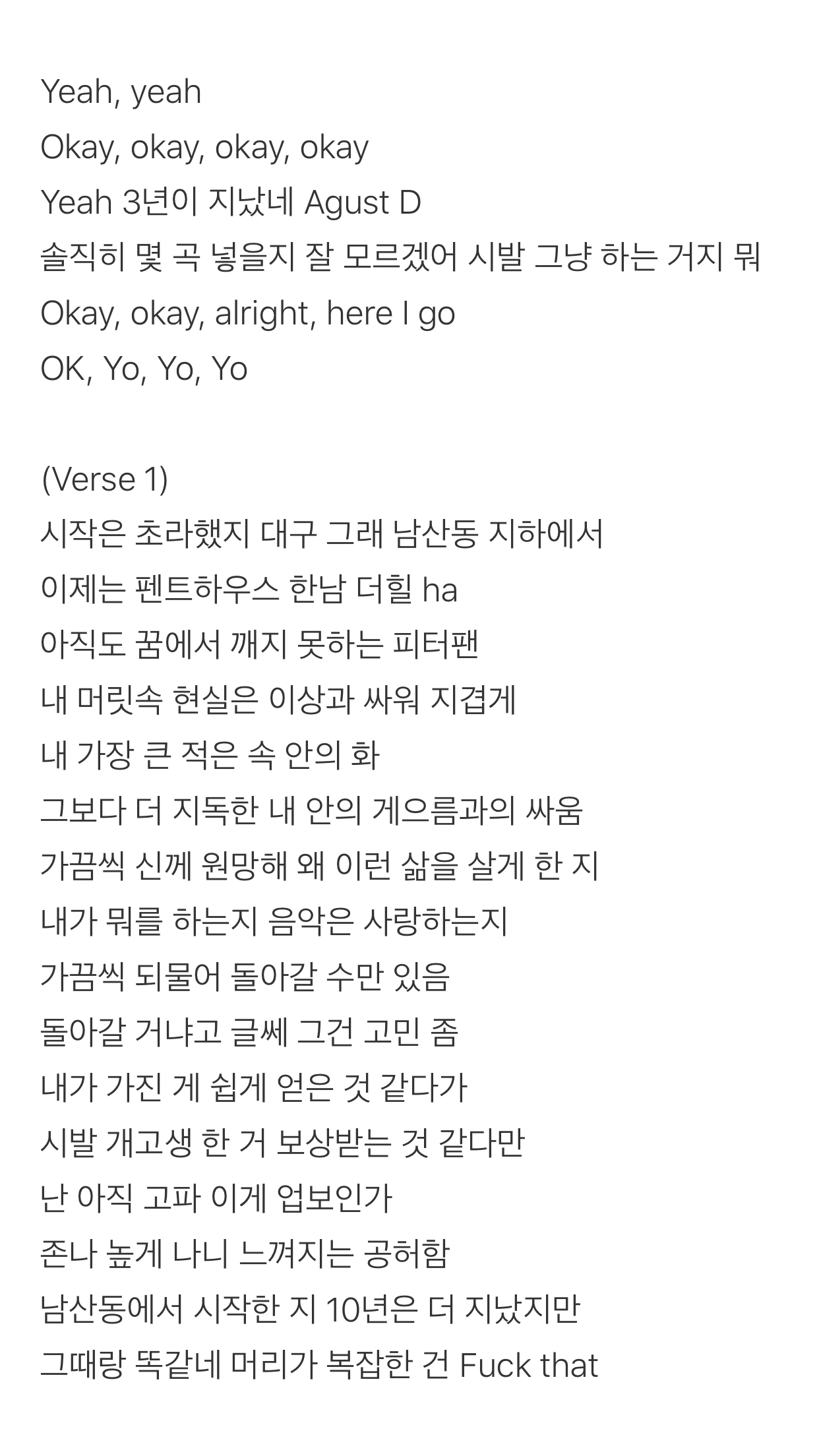 가사가 통째로 너무 좋아서 다 가져왔다. 이 곡은 인간 민윤기가 살면서 느낀 감정과 통찰(?) 같은 거 담은 깊이 있는 가사지만, 비트도 그렇고 곡 전반적인 분위기는 무겁지 않고 밝은 느낌을 준다. 소탈한 느낌이나~ 쏘 cool~
