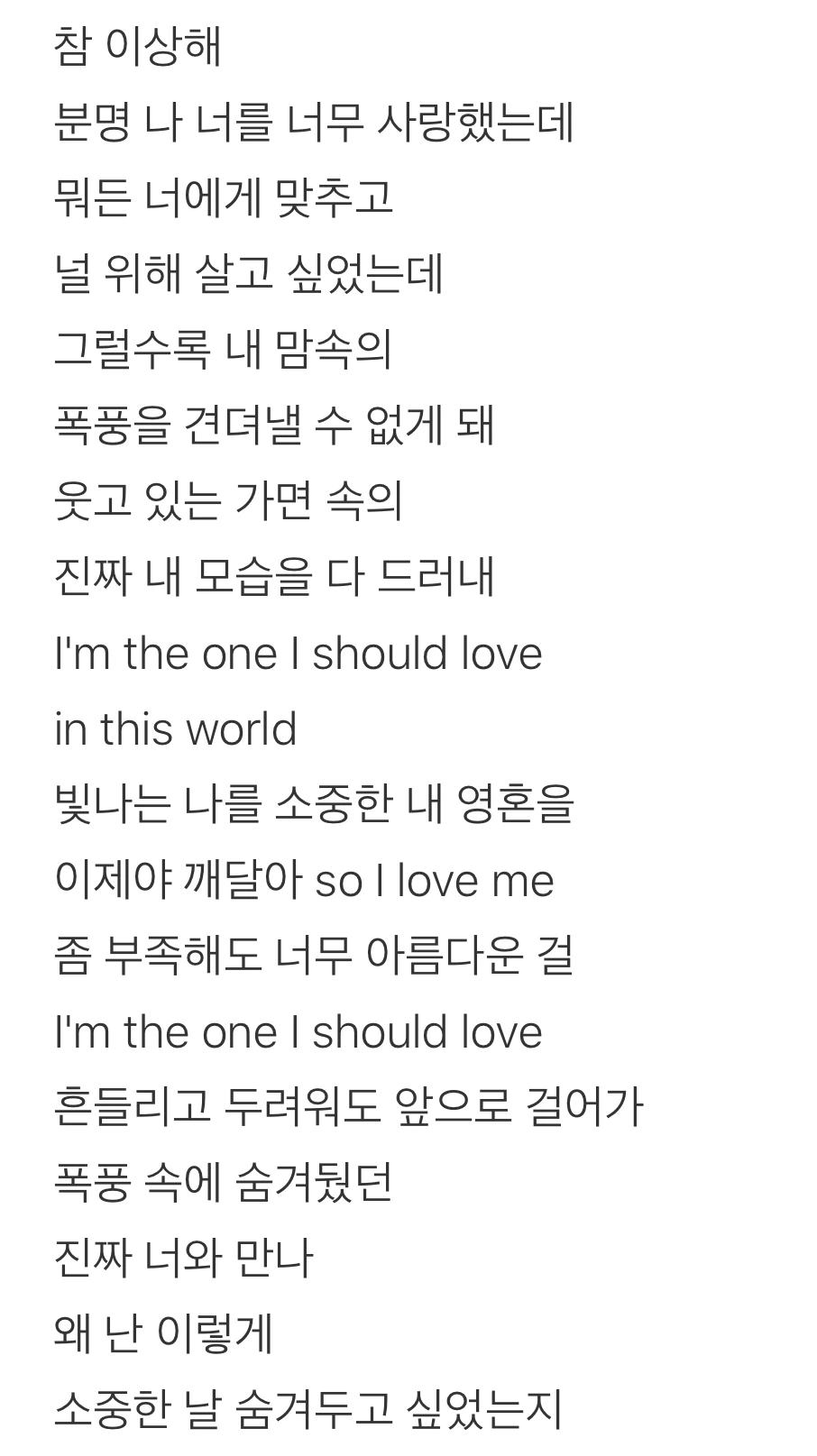“조금은 뭉툭하고 부족할지 몰라”도 “지금껏 살아온 내 팔과 다리 심장 영혼을 사랑하고 싶어”라는 가사가 마음에 와닿는다. 내가 정말 그러고 싶거든.