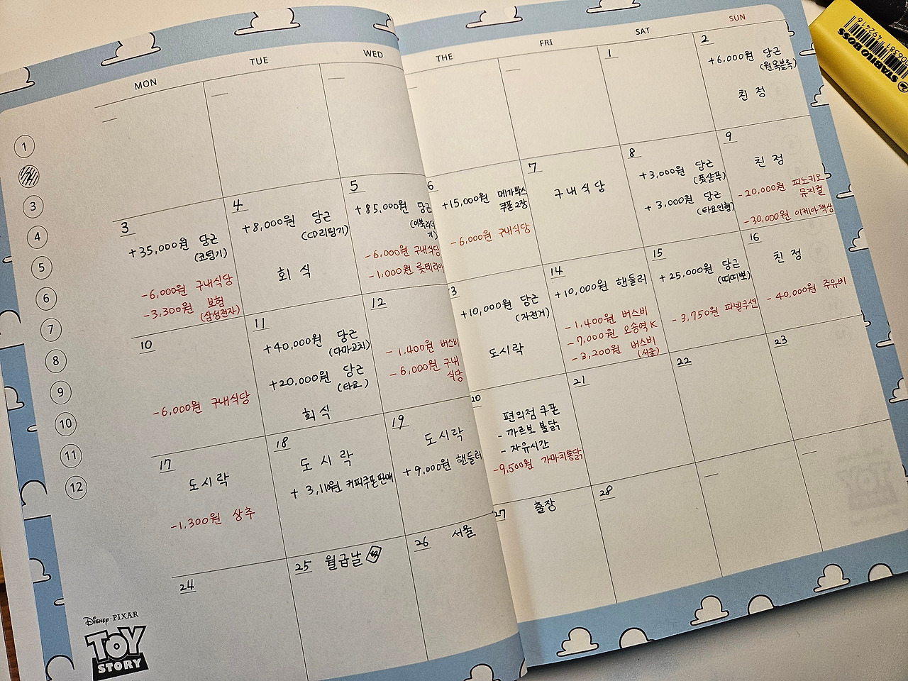 이렇게 다이어리의 먼슬리를 활용하니 그날의 수입/지출을 한눈에 파악이 가능하다는 장점이 있었다.