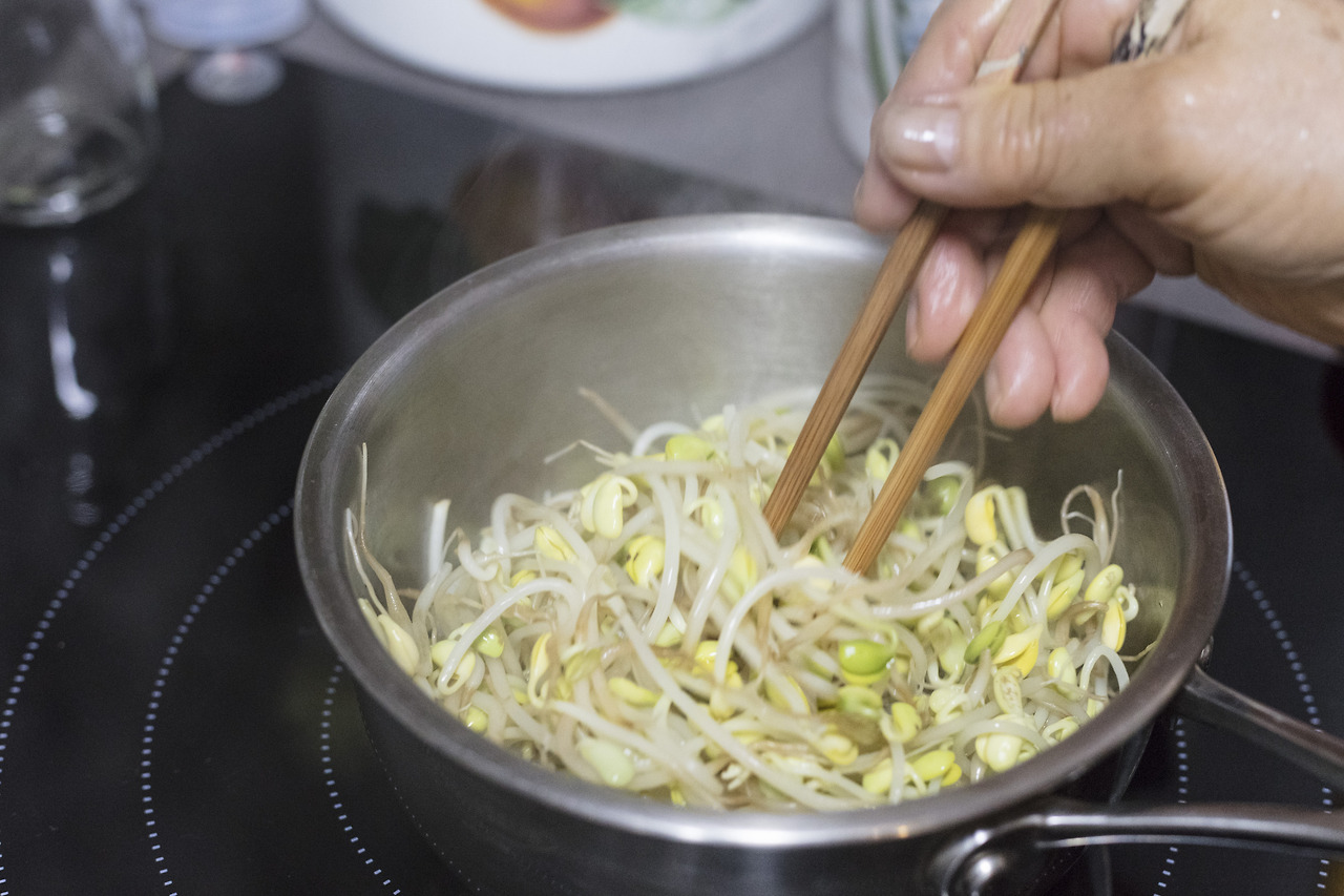냄비 바닥이 잠길 정도의 소량의 물을 사용해 데치듯이 콩나물을 삼는다. 냄비 뚜껑을 닫으면 콩 특유의 비린내가 나기 때문에 뚜껑은 사용하지 않는다. 콩나물 줄기의 색이 투명해질 때쯤 불에서 내리고 체에 밭쳐 물기를 뺀다.