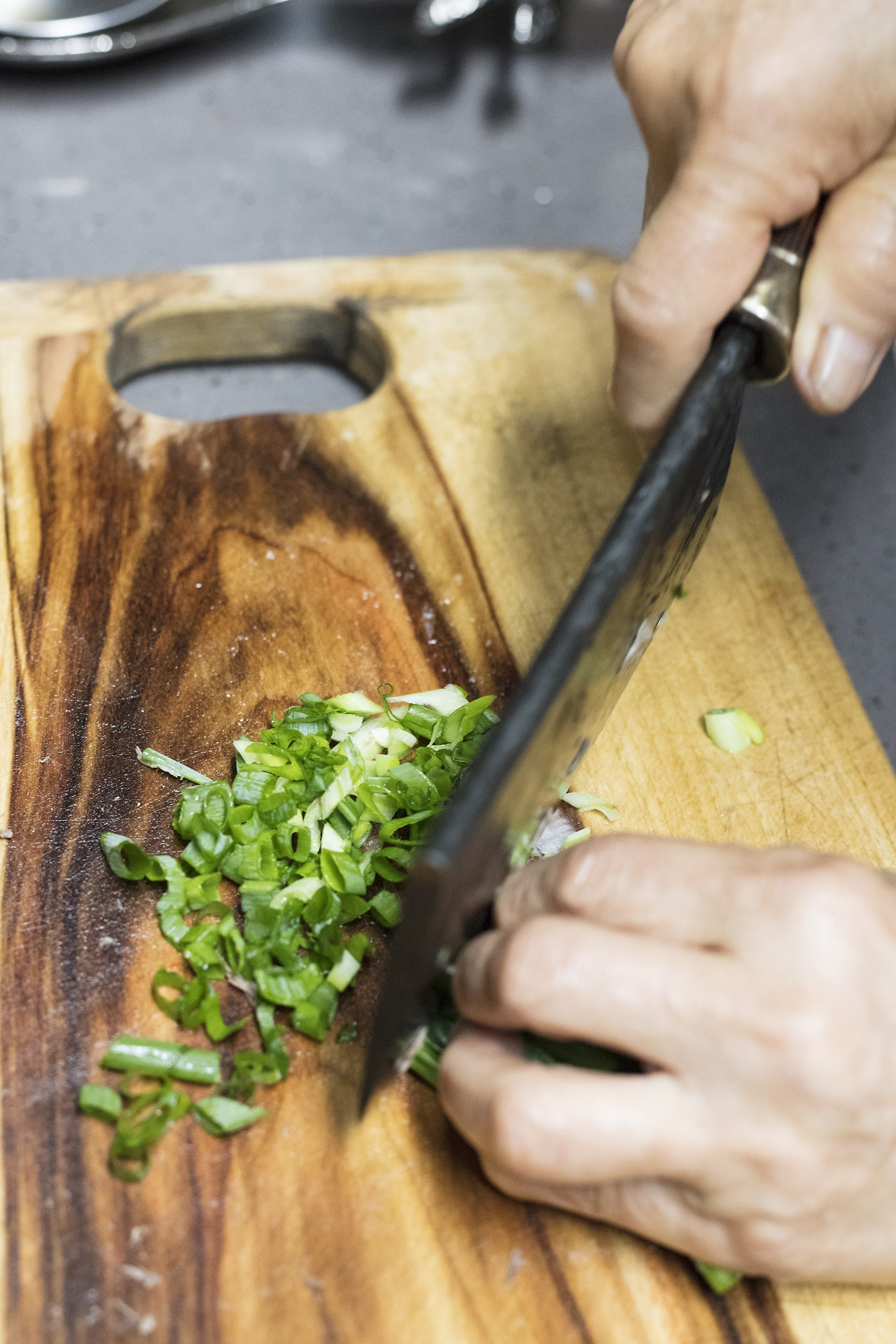콩나물 무침에 들어갈 파를 준비한다. 누구는 식감 때문에 콩나물 무침에는 파의 하얀 부분만 사용한다지만, 위든 아래든 골고루 먹어야 된다는 주의인 엄마는 파의 위, 아래를 모두 사용한다. 파, 마늘, 깨 간 것, 소금을 넣고 콩나물을 무쳐 준다.
