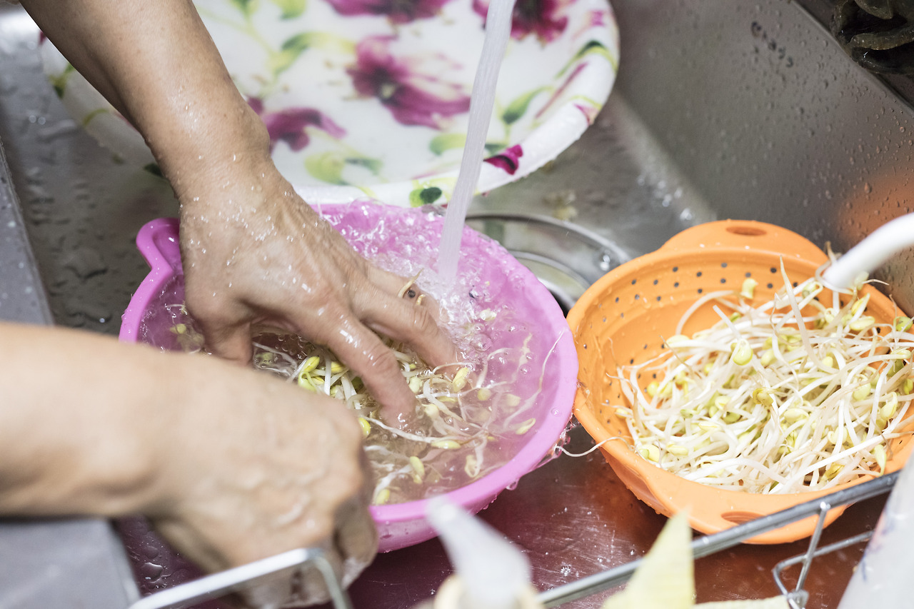 잘 손질한 콩나물을 흐르는 차가운 물에 씻는다. 너무 박박 씻지 않도록 주의한다. 다 씻은 콩나물은 체에 밭쳐 물을 뺀다.
