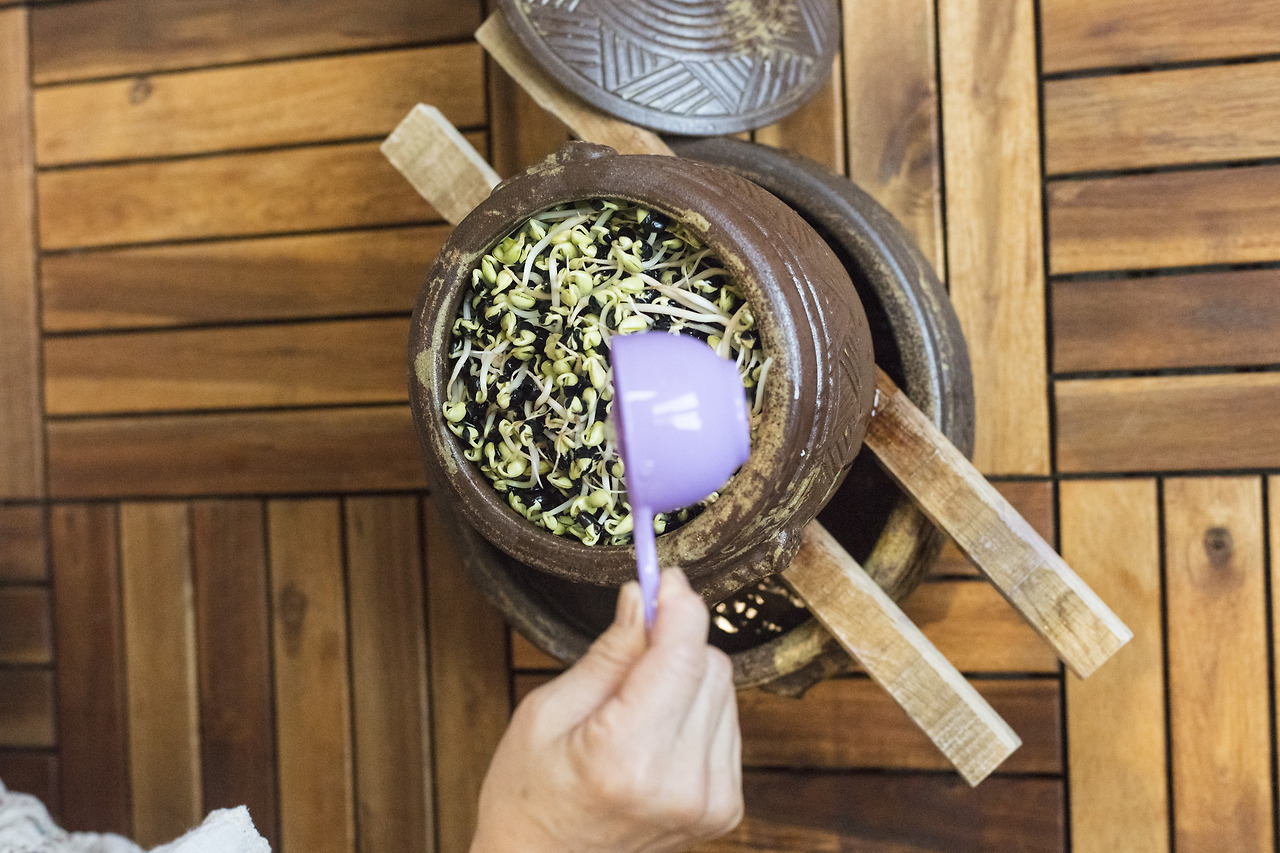잘 자란 콩나물들을 시루에서 뽑아낸다. 억세 지지 않게, 좀 짧다 싶을 때 뽑아내는 게 중요하다. 콩나물 대가리를 다듬고 빛이 통하지 않는 검은색 비닐봉지에 보관한다. 그래야지 콩나물이 자라서 초록색으로 변하는 것을 막아 주고 부드러운 식감의 콩나물 무침을 만들 수 있다.