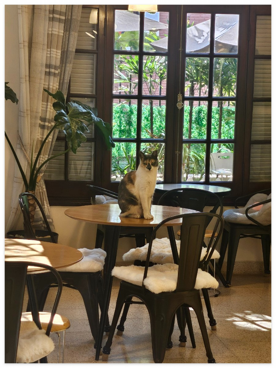 3마리의 고양이와 함께 운영되고 있는데, 카페에 들어서면 아기자기한 고양이 장식과, 어떨 땐 손님용 의자에, 때로는 뒤뜰에서 놀고 있는 고양이를 함께 볼 수 있는 곳.