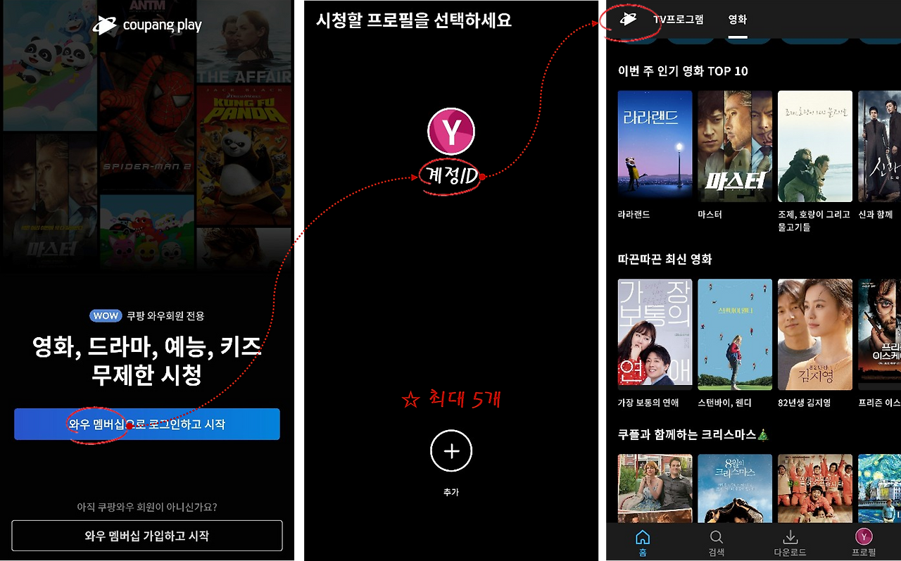 해당 앱을 설치하면 메인 홈이 나오고요 '쿠팡 와우회원 전용'이 보입니다. 이 서비스를 이용하려면 반드시 와우회원 멤버십으로 등록해야 한다는 거죠. 만약 쿠팡의 와우멤버십 회원이었다면 바로 이 서비스를 무료로 이용할 수 있습니다. 계정은 최대 5개까지 만들 수 있고요, 생성된 계정으로 로그인하면 메인 화면에 콘텐츠 목록이 보입니다. 어디서 많이 보던 익숙한 화면이죠?^^