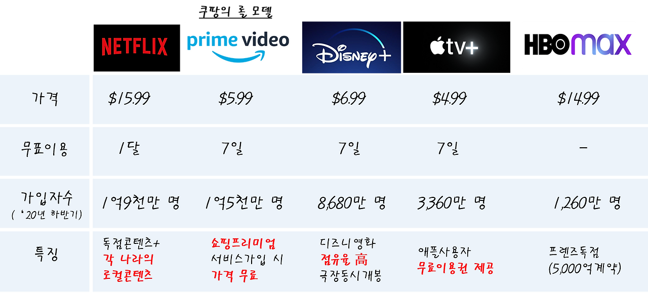이에, OTT 춘추전국시대라고 할 만큼 국내외 OTT 제공 업체가 등장하고 있습니다. 국내에서는 왓차, 웨이브, 티빙 등이 있고, 국외에서는 넷플릭스, 아마존의 프라임비디오 등이 있습니다. 각 회사에서는 OTT 콘텐츠를 발굴 및 계약하고 마케팅과 운영을 직접 하고 있습니다. '21년 하반기 기준, 미국의 OTT서비스 Top5에는 넷플릭스, 프라임비디오, 디즈니플러스, 애플TV, HBOMAX가 올랐습니다. 전 세계적으로 OTT서비스의 강자는 '넥플릭스'가 단연 선두입니다. '21년에 디지니플러스와 애플TV가 국내에 도입될 예정이라고 하니 이들의 가격과 콘텐츠 등 국내에서의 다양한 경쟁력과 차별성이 궁금해집니다. 쿠팡은 이커머스 사업부터 롤모델이 아마존이라고 했는데요 OTT서비스도 아마존의 프라임비디오 사업모델을 롤모델로 했다고 할 수 있습니다.