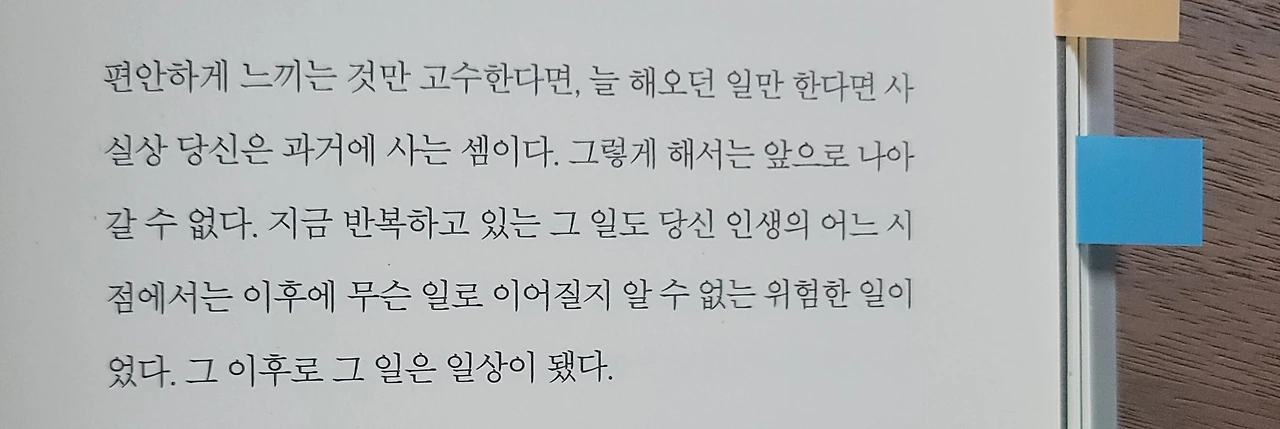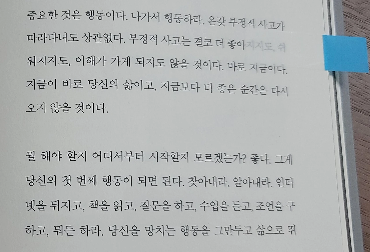 반복되는 일상에 너무 편해져 있지 않은지 생각해본다. 나는 묵묵히 전진하는 사람인가? 아니면 편안함을 버리고 불확실성을 받아들이며, 무엇인가를 행동으로 하는 사람인가? 더 나은 사람이 되려면 무조건 무엇이든지 시작하고, 행동으로 실천되어야 한다라는 생각은 100% 공감한다.