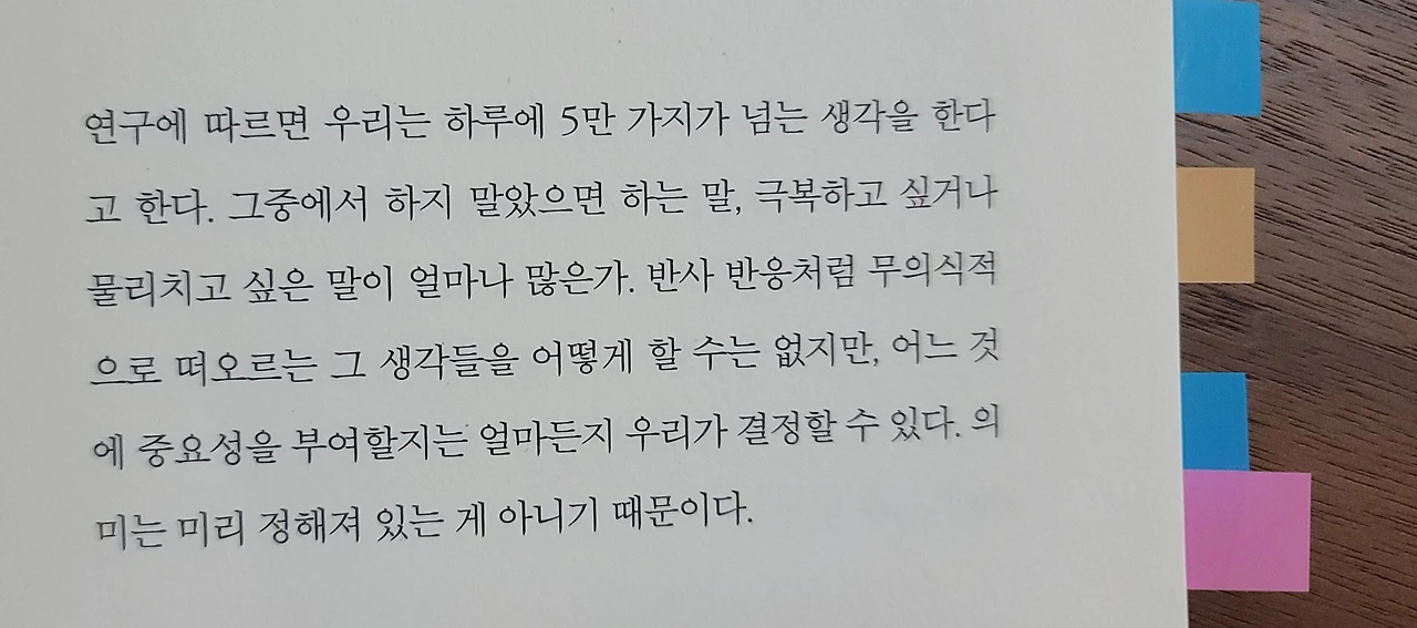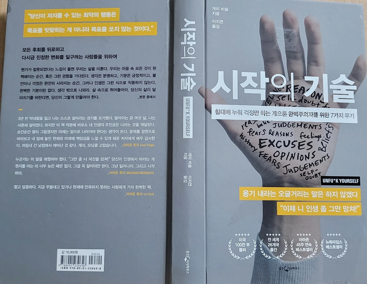 시작의 기술하루에 5만 가지가 넘는 생각을 한다고 한다. 얼마나 긍정적인 생각을 하고, 발전적인 고민을 할까? 매일이 아름답고 즐겁지 많은 아닌 건 당연하다. 뜻대로 되지 않는 것도 많다. 이럴 때 인생이 쉬워지고, 삶을 바꾸고, 변화에 대한 갈증이 있는 사람에게 저자는 얘기한다."단언 형태의 자기 대화는 지금 당장 여기서 내가 이 순간의 주인임을 천명하는 것이다. '나는 ~이다', '나는 ~를 환영한다', '나는 ~를 받아들인다', '나는 ~라고 단언한다'라고 말한다. '할 거야', '될 거야'라는 식의 서사보다는 더 강력한 명령의 언어를 사용하는 방법이다.