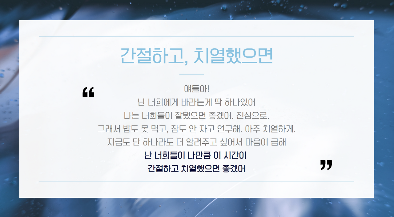 SNS를 통해 핫하다고 해서, 주변에서 재미있다고 해서 보기 시작한 드라마 대사이다. 놀라웠다. “와. 강사가 저런 생각을?” 일반적으로 직장인들은 생계를 위해 일한다고 볼 수 있다. 그렇다 보니, 어쩌면 일이 힘들다는 것은 ‘월급’을 받기 위해 해야 하는 당연한 것일지 모른다. 그런데, 직장에서 ‘일’뿐만이 아닌 그 이상의 무언가 가치를 준다면 금상첨화일 것이다. 직장인에게 '그 이상'의 가치는 무엇일까? 드라마의 이 명대사처럼, 어쩌면 자신이 당연하게 해야 하는 일을 ‘치열하게 그리고 누군가를 위해 간절함’을 담아 처리할 때 그 누군가가 얻는 무엇(?)이 아닐까 생각한다.