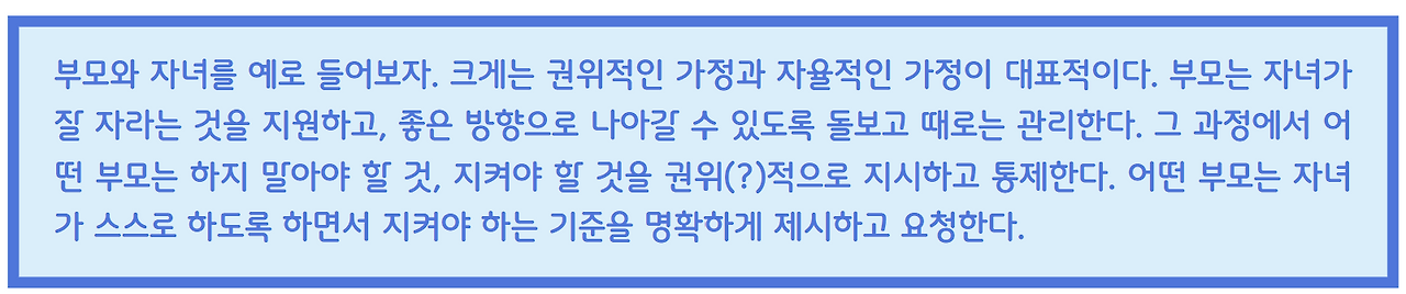 리더와 팀원은 조직에서 원하는 목표(=리더와 팀원이 협업하여 이루어야 하는 목표)는 동일하지만, 각자의 역할은 다르다. 역할을 수행하다 보면, 자칫 '리더의 관리'가 아니라 '리더의 통제'가 발생된다. 어디까지가 통제이고, 어디까지가 관리일까? 모호한 부분이 있다.