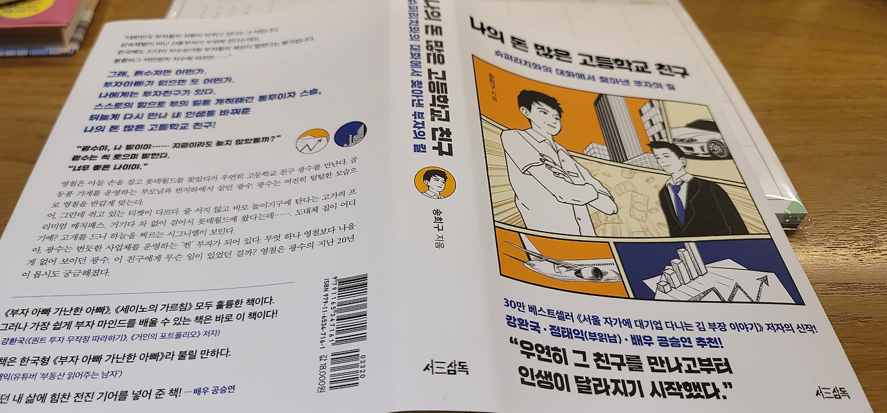 오랜만에 운동을 하고 집으로 돌아가는 길에 서점에 들렀다. 이쁜 표지의 책이 눈에 띈다. 책 제목은 '나의 돈 많은 고등학교 친구'이다. 작가는 송희구!! 반가운 사람이다. '대기업에 다니는 김부장 이야기'의 저자이다. 내가 좋아하는, 믿고 사는 책의 저자중의 한 명이다. 유명한 재테크 유튜버 부읽남의 추천서가 눈에 들어온다 '이 책은 한국형 부자 아빠 가난한 아빠'라고 불릴만 하다. "아!! 대충 알겠다"라고 생각하면서 책을 들었다. 나중에 알고 보니 이미 이 책의 스토리는 제작사에서 드라마 제작중이라고 한다. 부럽다!!