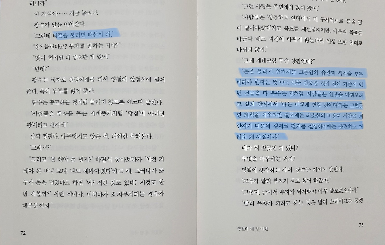 "사람들은 돈을 많이 벌어야겠다고 목표를 재설정하지만, 목표를 바꾼다 해도 과정이 바뀌지 않는다면 인생 또한 절대로 바뀌지 않지. 돈을 불리기 위해서는 그동안의 습관과 생각을 모두 버려야 한다는 뜻이야. 신축 건물을 짓기 전에 기존에 있던 건물을 다 부수는 것처럼"