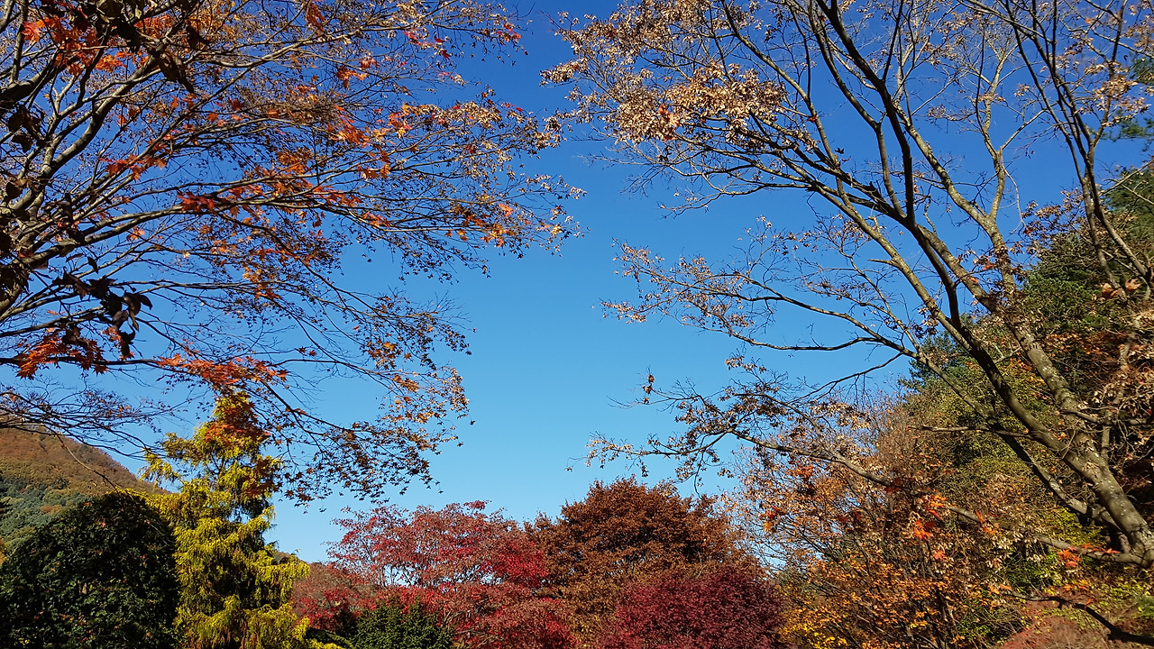 구름 한 점 없는 맑은 하늘에 서로 다른 나무의 가지들이 맞닿아있다.