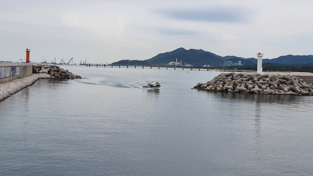 파도 머리엔 고깃배가 각기 동서로 왔다 갔다 하네.