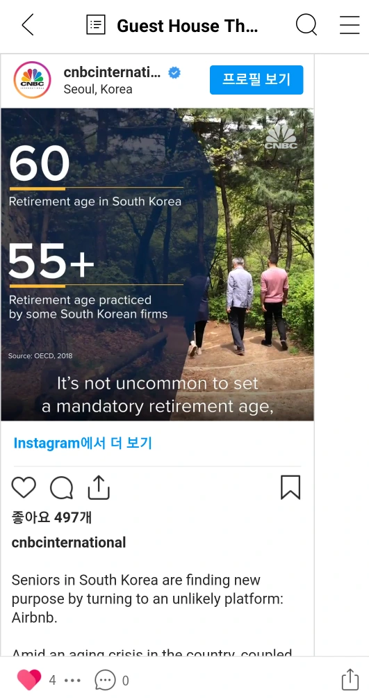 대기업에서 해외지사장으로 근무하다 정년퇴직을 한 친구는 퇴직자금을 모두 쏟아부어 부암동에 게스트하우스를 마련했다. 음식 솜씨가 좋은 친구 부인은 외국인들에게 한국요리를 가르쳐주는 등 인상적인 추억을 심어줬다. 친구는 가이드를 자처하여 서울시내 곳곳을 안내하기도 하고 저녁에는 서울성곽길 북악산 코스를 같이 걷기도 하며 우리 역사를 알렸다.부부의 노력에 호응하여 다녀간 외국인들도 입소문을 내면서 'Lonely Planet(세계에서 가장 많이 팔리는 여행 가이드 북)'에 소개되었고, 미국 CNBC도 '한국 은퇴자의 생활 (A second career as Airbnb hosts)'이라는 제목으로 40분짜리 프로그램을 제작해서 방영했다.