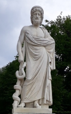 그리스·로마 신화에 아스클레피오스라는 ‘건강의 신’이 나온다. 그는 건강한 뱀이 병든 뱀을 위하여 이름 모를 잎사귀를 물어다가 살리는 장면을 목격했다. 그 모습을 보고 아스클레피오스는 약초에 대해 알게 되어 상처를 아물게 하고 병을 낫게 하는 약을 개발했다. 그의 처방과 치료로 수많은 사람이 목숨을 건지자 고대인들은 그의 신전에서 하루를 보내기만 해도 모든 병이 낫는다는 신앙을 갖게 되었다고 한다. 그의 상징은 ‘아스클레피오스의 지팡이’라고 알려진 지팡이로 뱀 한 마리가 똬리를 틀면서 지팡이를 기어오르는 모습으로 표현된다.