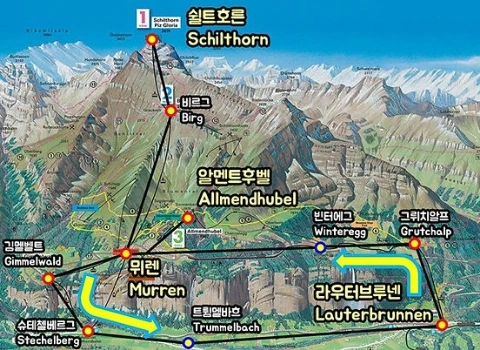 트뤼멜바흐 폭포는 세계에서 유일한 빙하 폭포로 리프트, 갤러리(좁은 통로), 터널, 길과 플랫폼을 통해 지하로 접근 가능하다. 이 폭포를 통해 융프라우 빙하가 녹은 물이 초당 최대 2만 리터 가량 산 아래로 흘러간다. 이 물을 통해 연간 2만 톤이 넘는 바위와 자갈이 이동하는데, 이 과정에서 온 산이 진동하며 천둥 치는 듯한 소음이 생겨난다.