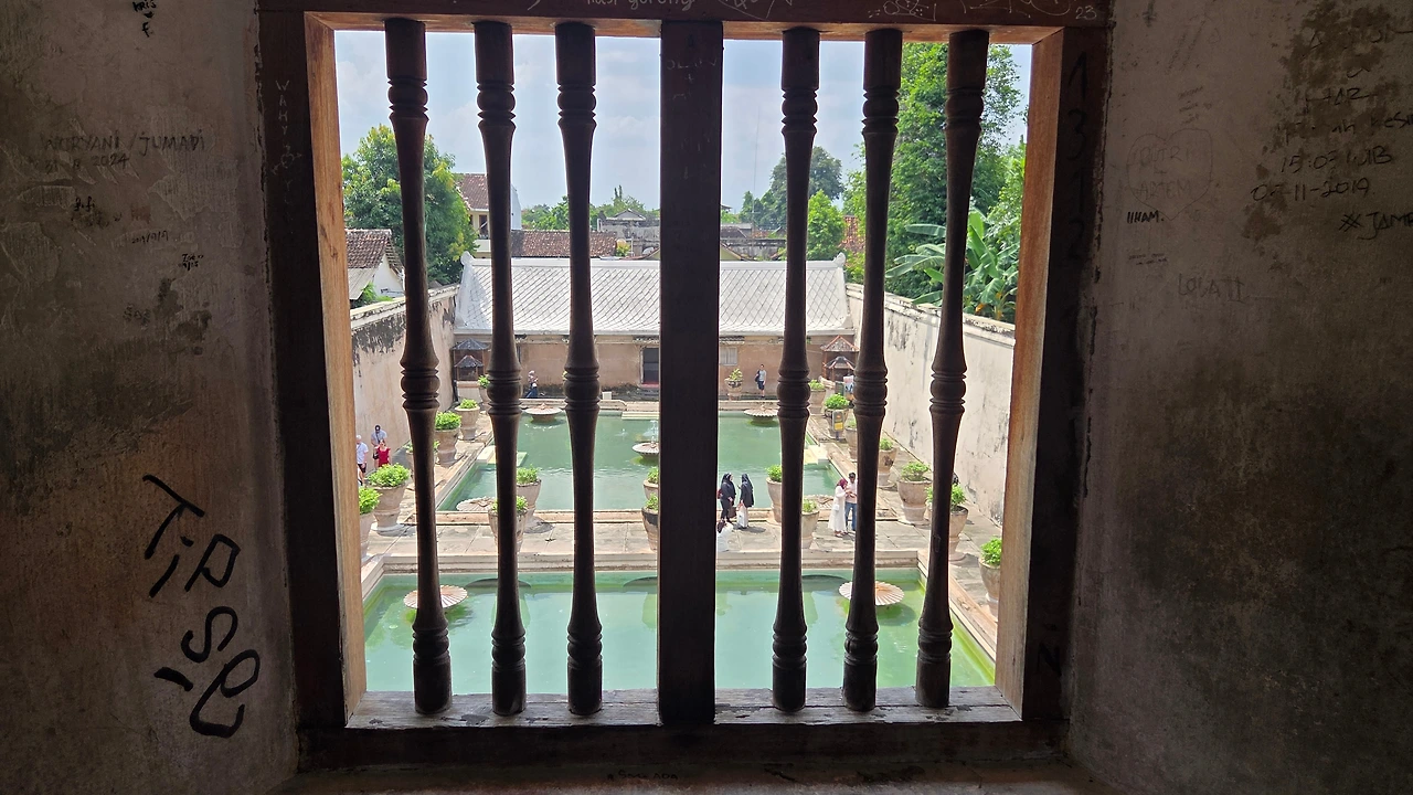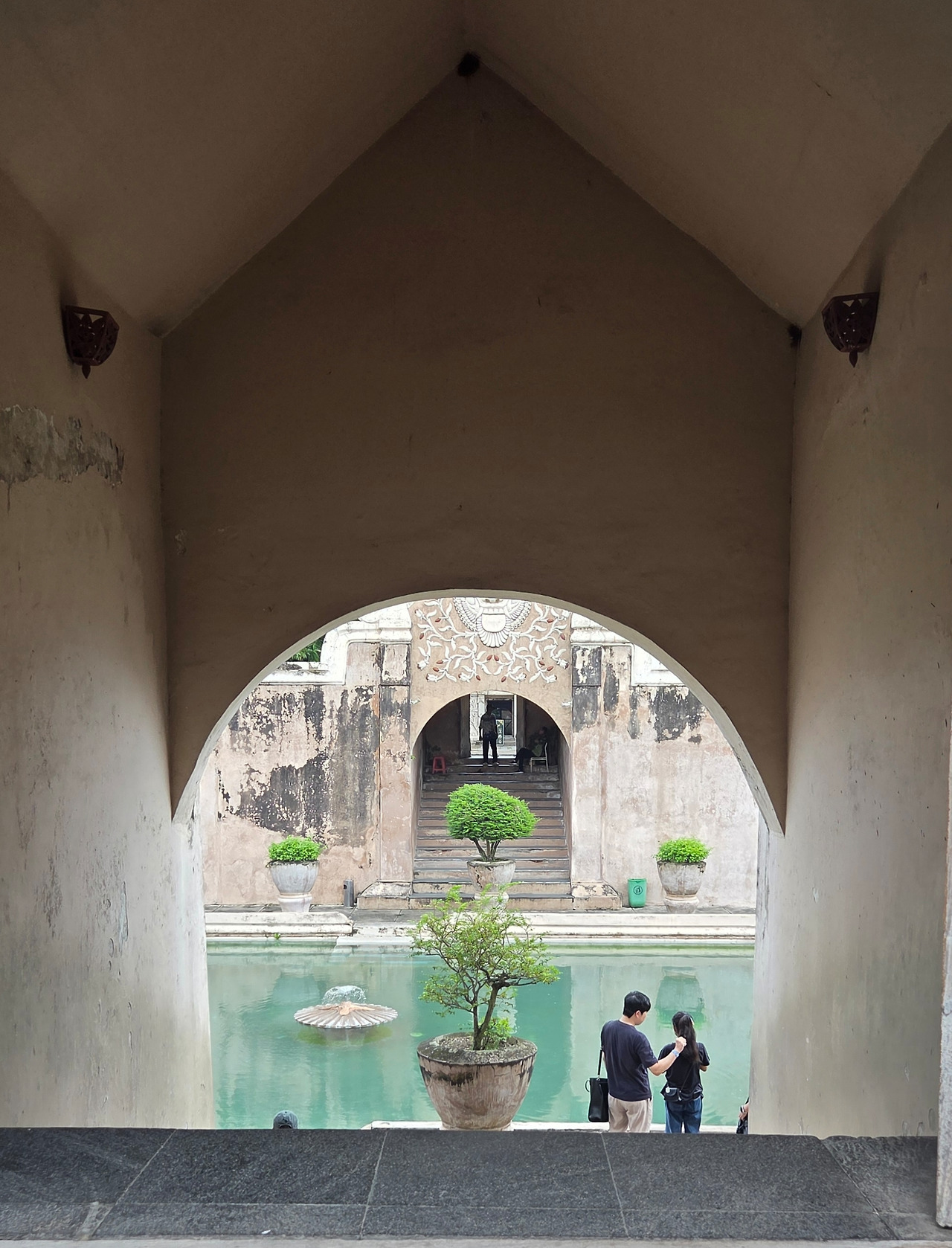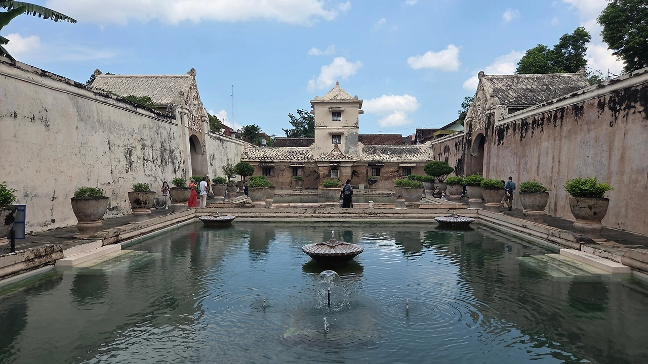 ‘꽃의 정원’이라는 본래 이름보다 ‘물의 궁전’으로 더 많이 알려진 따만 사리(Taman Sari). 크라톤 왕궁에서 남쪽으로 500m쯤 떨어진 곳에 왕과 왕족의 휴식을 위해 지어진 별궁이었다. 위급 시에는 요새로도 쓸 수 있게 설계되었다고 한다. 술탄 하멩쿠부워노 1세는 1758년 포르투갈과 자바 양식을 혼합하여 10헥타르(약 3만 평)의 부지에 수영장, 인공호수, 섬, 지하통로 및 수로 등을 건설하였다. 이곳에서 만난 자원봉사자는 크라톤 왕궁과 따만 사리가 지하수로로 연결되어 있었고, 술탄은 카누를 타고 이동했다고 한다. 이 수로는 1867년 므라피 화산 폭발 때 파손되어 지금은 볼 수 없다고 한다.