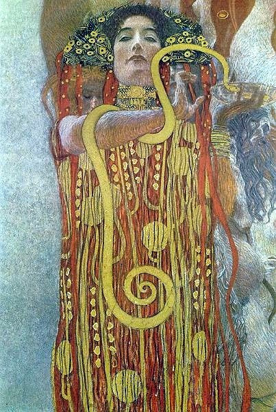 히게이아는 왜 뱀과 그토록 친숙한 모습일까? 그녀의 아버지 아스클레피우스 때문이다. 아스클레피오스는 건강한 뱀이 병든 뱀을 위하여 이름 모를 잎사귀를 물어다가 살리는 장면을 목격한다. 그 모습을 보고 그는 약초를 알게 되어 상처를 아물게 하고 병을 낫게 하는 약을 개발하게 된다. 이때부터 뱀은 치유, 재생, 회복의 상징으로 떠오르게 된 것이다.