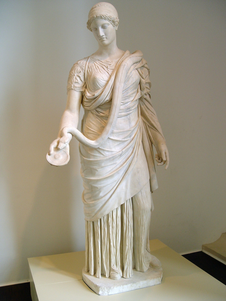 몸에 뱀을 휘감고 있는 여자가 히게이아라면 뱀이 휘감고 있는 지팡이를 지닌 남자는 아스클레피우스다.