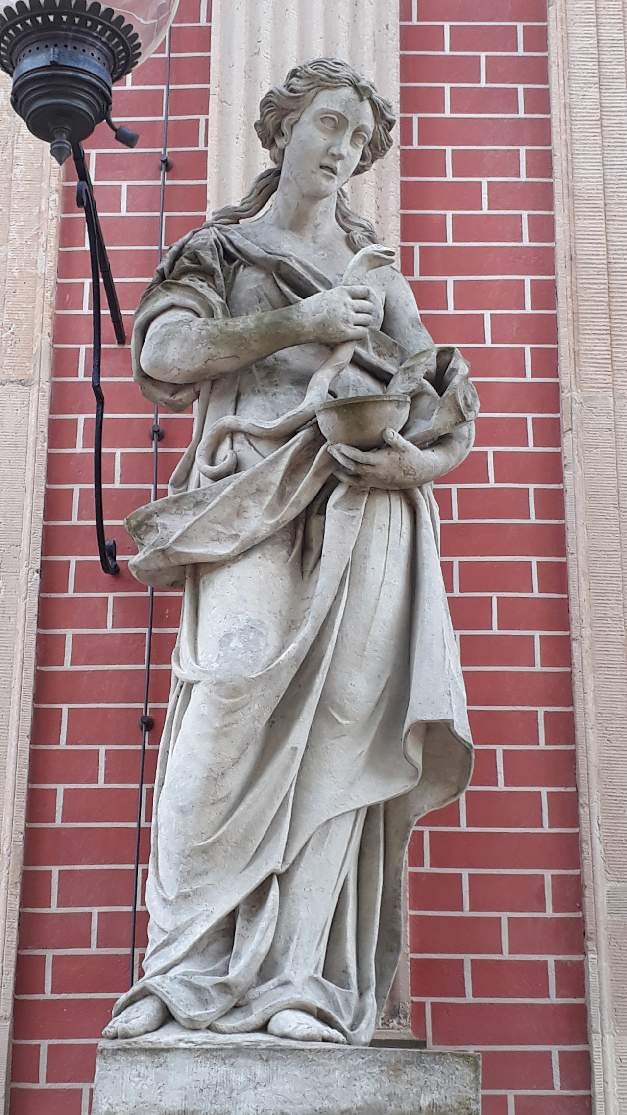 Hygieia(히게이아)는 그리스 신화에 나오는 건강과 위생의 여신이다. 의학과 치료의 신 아스클레피우스(Asclepius)의 딸이기도 한데 큰 뱀에게 휘감겨 있거나, 큰 뱀에게 물이나 먹이를 주는 모습으로 묘사된다. 히게이아 성배는 뱀이 잔에 담긴 물이나 먹이를 먹는 모습을 형상화한 것이다. 건강과 위생의 신 히게이아 때문에 히게이아의 성배가 독일의 약국 표시에 들어간 것이다.