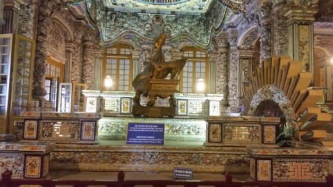 계성전(啓成殿). 카이딘 황제가 잠들어 있는 곳이다. 황제의 신장은 150cm 정도로 관료를 뽑을 때도 자기보다 키가 큰 사람은 뽑지 않았다는 이야기가 전해 온다. 황제의 관은 동상 아래 18m 지점에 안치되어 있다. 황제는 능을 만들기 위해 후에에서 목조 군함과 죄수, 궁인들을 동원했고 수많은 풍수지리학자들의 의견을 받아 산의 경사면을 깎았다고 한다. 자기의 유택인 능을 짓기 위해 카이딘 황제는 정부 예산의 30%를 쏟아부었고 이로 인해 폭동까지 일어났었다고 하니 얼마나 큰 공사였는지 미루어 짐작할 만하다.