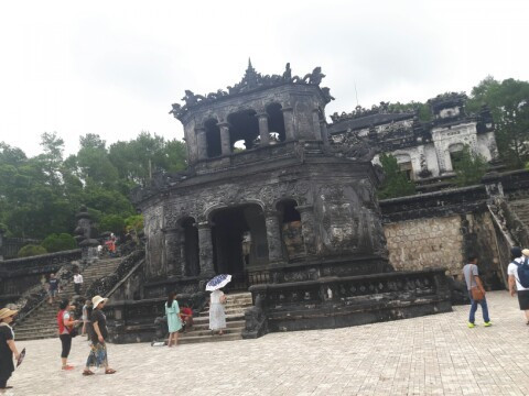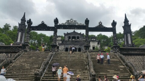 카이딘(啓定, Khai Dinh) 황릉에 도착했다. 혹자는 '세상에서 가장 아름다운 무덤'이라고도 한다. 카이딘 황제는 베트남의 마지막 왕조인 응우엔 왕조의 12대 황제로 재위 기간은 1916년부터 1925년까지 9년에 불과했다. 국민들은 "조국을 프랑스에 팔아넘기고 민중들은 프랑스에 착취당하고 있는데, 궁전에서 화려한 생활만 하고 있다."며 카이딘 황제를 격렬하게 비난했다. 능은 1920년에 시작하여 1931년에 완성된 건축물로 바로크 양식에 중국 및 베트남 양식이 가미됐다고 한다. 무덤 같지 않은 이 건축물은 프랑스 식민지배의 영향으로 베트남의 전통이 무너져 내리는 것을 보여주는 상징물이라는 평가도 받는다.