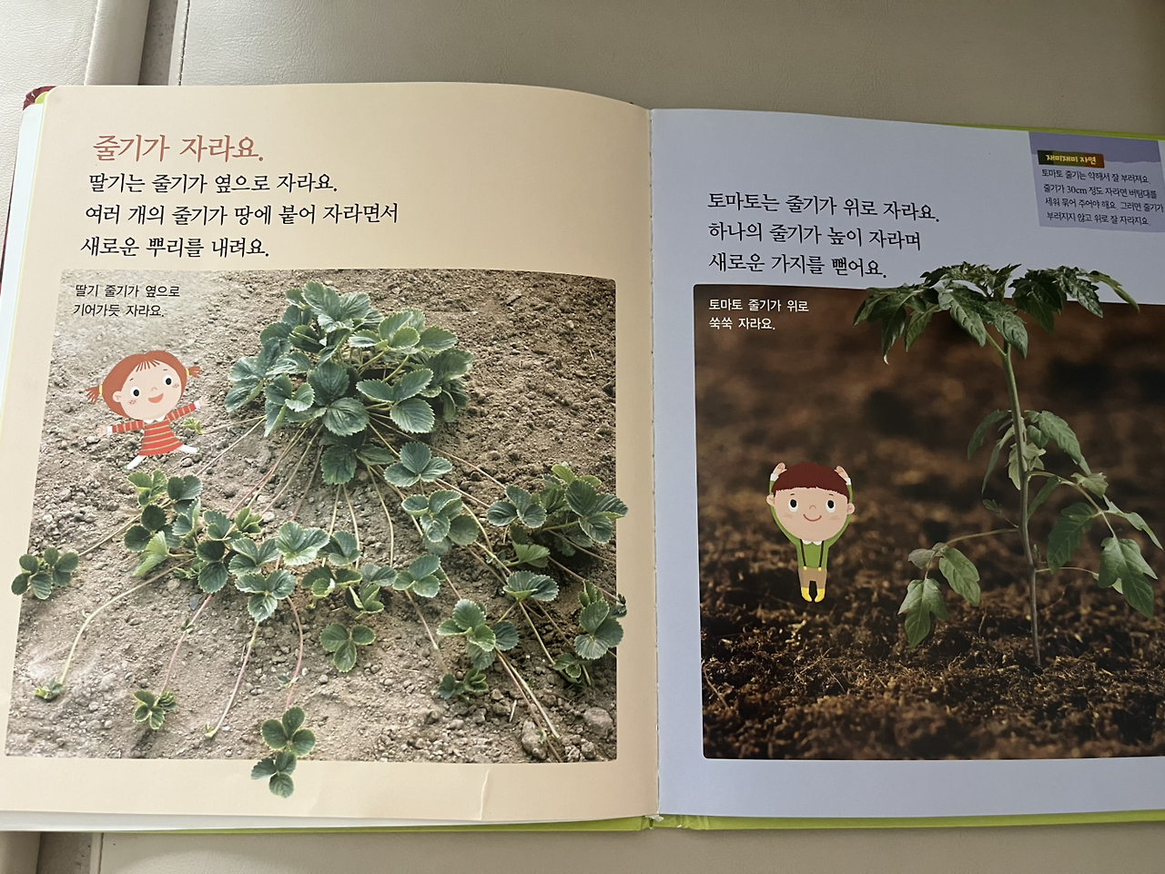 어젯밤 또 이 책을 읽어 주는데, 한 부분이 눈에 띄었습니다. 딸기는 줄기가 옆으로 자라서, 땅에 붙어 자라면서 새롭게 뿌리를 내리고, 반면 토마토는 줄기가 위로 자라서 옆으로 가지를 친다는 점이 말이에요. 자라는 방식이 다른데, 저처럼 문외한이 딸기를 키운다면 왜 줄기가 위로 쑥쑥 자라지 않나 고민했을 것 같기도 해요.