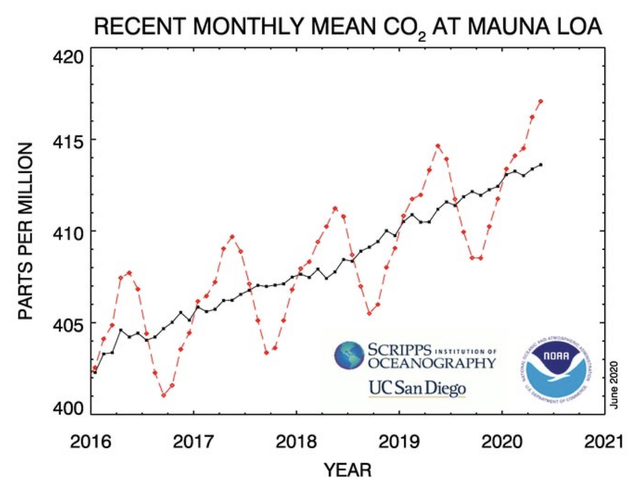 최근 코로나 사태로 인해 경제 활동이 현저하게 감소했는데도 불구하고 대기 중 이산화탄소 농도는 최고치를 기록했다는 보도가 있었습니다. 5월 기준으로 대기 중 이산화탄소 농도가 417.2ppm을 기록함으로써 지난해 414.8ppm 대비 2.4ppm만큼 증가했다고 해요. 전 세계가 이번 상반기에 거의 멈춰 있었던 것 같은데 왜 그런 것일까요?