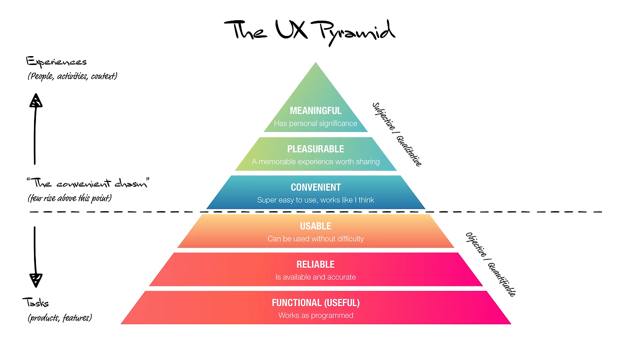 이를 더 살펴보기 위해, 사용자의 경험을 구성하는 속성에 대해서 여러 이론들이 있지만 그 중에서도 대표적인 UX피라미드 프레임워크를 통해 먼저 경험의 속성을 나눠보기로 한다.