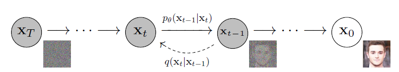 그림 1과 같이, 처음엔 완전한 노이즈(잡음)에서 시작해서 한 단계씩 노이즈를 제거하면 마지막엔 사진처럼 보이는 이미지가 나온다(좌->우). 이 과정은 이전 단계만 보고 다음 단계를 결정하는 마르코프 체인 과정이다. 그리고, 완벽히 정해진 값이 아니라 확률적으로 움직이는 확률 모델이다.