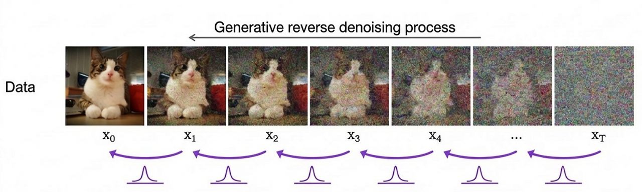 이후 실제 이미지 생성 단계에서는, 완전한 노이즈 상태에서 시작하여 학습된 pθ(xt-1|xt)를 반복 적용함으로써, 노이즈를 단계적으로 제거하고 점점 원본 이미지에 가까운 결과를 생성하게 된다.