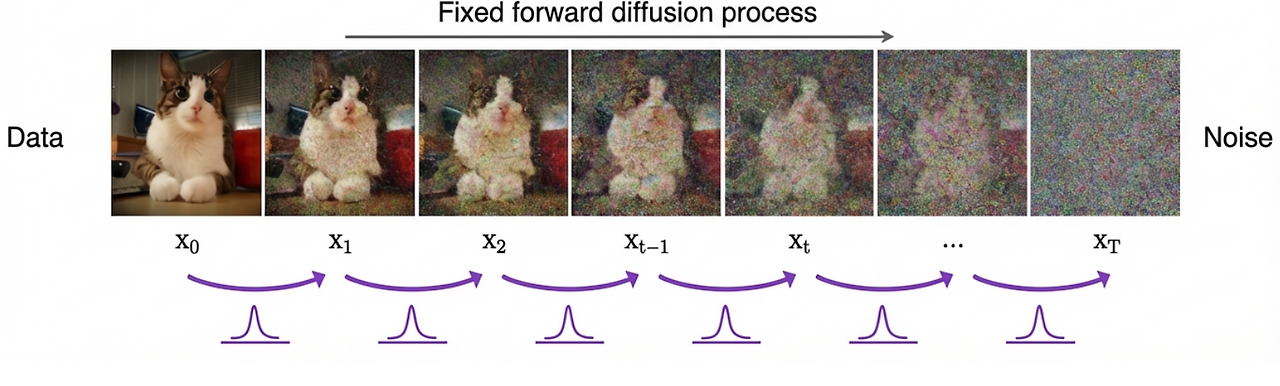 가우시안 분포는 ‘평균’이 중심이고, ‘분산’이 퍼짐의 정도를 정하는 종 모양 분포다. 확산 모델의 학습은 가우시안 분포에서 생성된 ‘정답 노이즈’를 기준으로, 그 분포의 평균(이전 이미지)을 얼마나 잘 복원하느냐를 지도학습 방식으로 반복하는 과정이다.