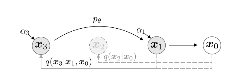 그림 4와 같이, 비마르코프적(Non-Markovian) 프로세스는 xt에서 xt-1로 갈 때 오직 직전 단계만 보는 것이 아니라, 원본 이미지(x0)에 대한 예측치를 직접 참조한다.