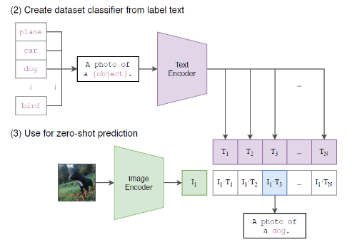 모델은 이 이미지가 어떤 문장과 가장 가까운지를 비교하고, 가장 유사도가 높은 문장에 해당하는 클래스를 선택한다. 예를 들어 새로 들어온 이미지가 강아지 사진이라면, “a photo of a dog”이라는 문장 벡터와 가장 가깝게 나타나고, 최종 예측 결과는 dog가 된다.