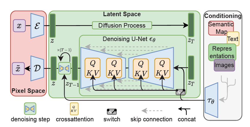 이렇게 해서 확산 모델은 zT에서 z로, 그리고 디코더를 통해 픽셀 이미지 x̃를 하나하나 만들어 가고, 텍스트 임베딩은 매 denoising step마다 교차 어텐션을 통해 참조되어 사용자의 의도와 맞는지를 지속적으로 반영한다.