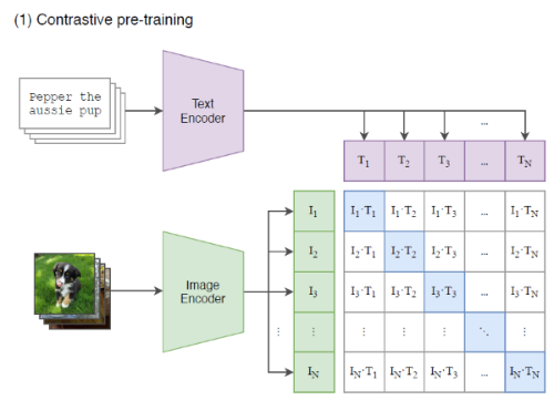 먼저 학습 단계에서는 수많은 이미지와 그에 대응하는 문장을 함께 보여준다. 예를 들어 강아지 사진과 “pepper the aussie pup”이라는 문장이 한 쌍으로 들어온다. 사진은 이미지 인코더를 거쳐 하나의 숫자 벡터로 변환되고, 문장은 텍스트 인코더를 거쳐 또 다른 숫자 벡터로 변환된다. 그다음, 한 번에 여러 장의 이미지와 여러 개의 문장을 한 묶음으로 놓고, 모든 이미지–문장 조합의 유사도를 계산한다.