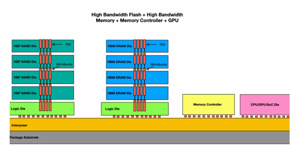 그러나 해당 설계에서는 인터포저라는 공통 기판 위에 모든 요소를 밀집 배치함으로써, GPU가 HBF에 저장된 대용량 데이터에도 매우 빠르게 접근할 수 있도록 합니다. 또한 HBM과 HBF가 서로 연결된 구조를 통해 데이터가 고속으로 이동할 수 있는 경로가 형성됩니다.