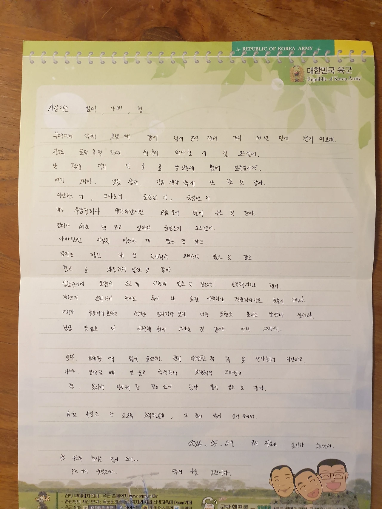 10년 만에 써본다는 편지에는 군대에서 느낀 너의 솔직한 감정이 그대로 드러나 있더라.