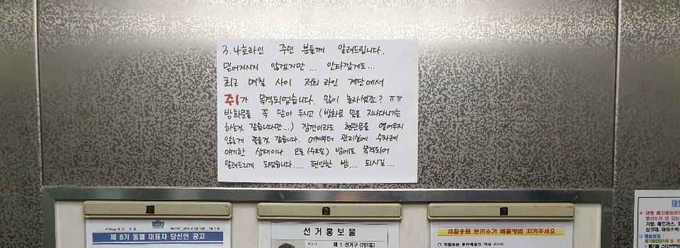 하지만 내가 붙여놓았던 안내문은 순식간에 떼어졌다. 밤에 붙인 후 다음날 이른 아침에 제거되었으니 본 사람은 많지 않았을 것이며 그 소동을 아는 세대도 일부였을 것이다. 누군가의 집으로 들어가 버렸다 해도 모를 일이었다. 씁쓸했다. 문제가 생겼다면 적극 알려 피해를 최소화하고 적극 방제에 나서야 하는 것이 정상인데 왜 쉬쉬하는지...