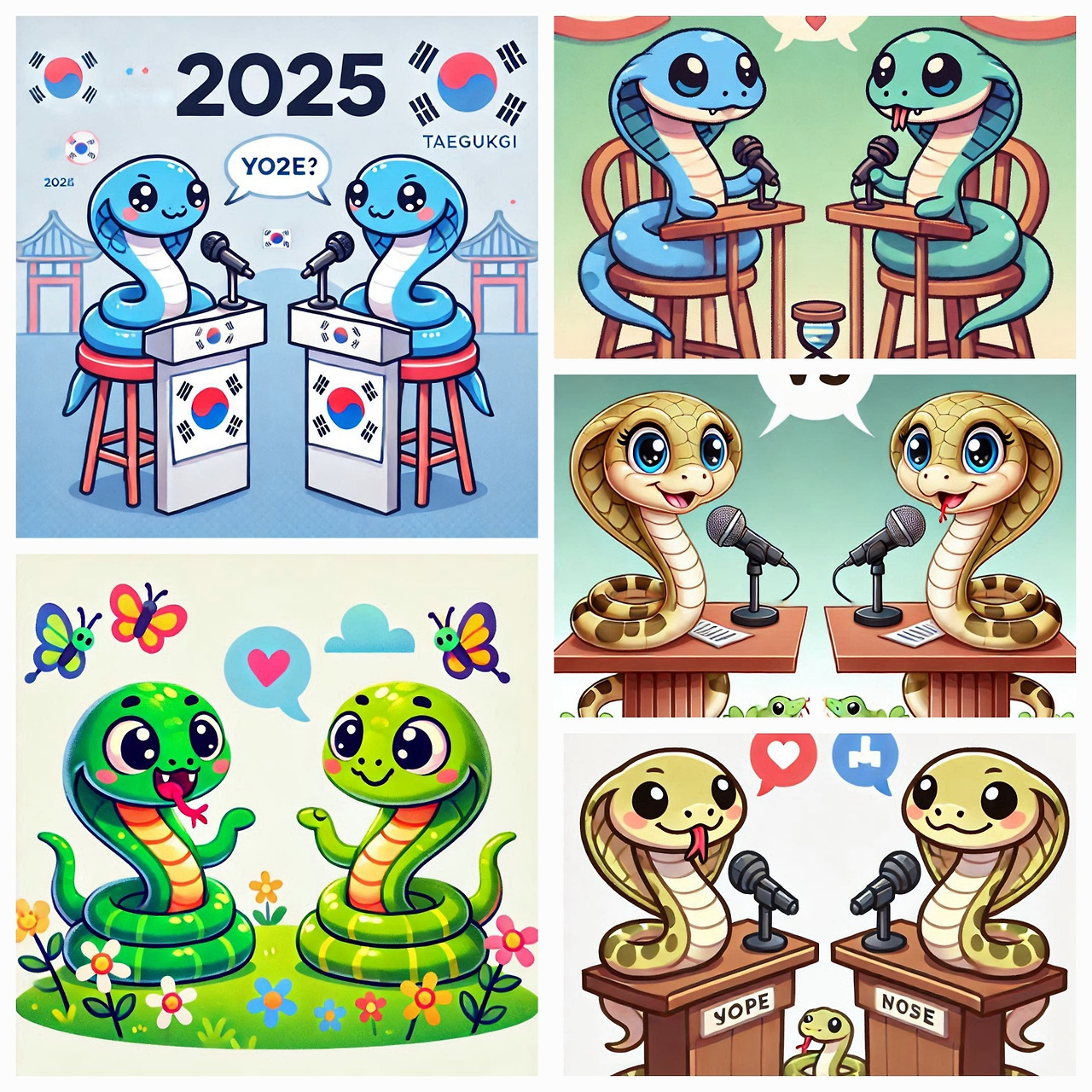 설에도 신년 인사를 나눌 테지만 1월 1일은 또 새해 첫날이니까 그냥 넘어가기 아쉬운 법. 단톡방 이곳저곳에서 신년 인사가 오갔다. 개성 넘치는 이모티콘과 정성스러운 연하장이 많기에 나도 한 번 만들어볼 요량으로 디자인을 도와주는 사이트에 들렀다. 푸른 뱀 캐릭터를 넣은 나만의 개성 넘치는 카드를 만들고 싶었건만, 뱀은 귀엽거나 친근한 캐릭터를 만들어내기가 힘든 동물이었다. 무엇보다 그놈의 혀가 문제였다. 어떤 귀여운 얼굴을 하고 있어도 두 갈래로 갈라진 혀가 더해지는 순간 간교하고 징그러운 이미지를 넘어설 수 없었다. 생성형 AI에게 도움을 청했지만 마찬가지였다. 장난 삼아 디베이트를 하고 있는 푸른 용 두 마리를 그려달라고 했는데, 오만가지 이상한 형상을 답이라고 내놨다.